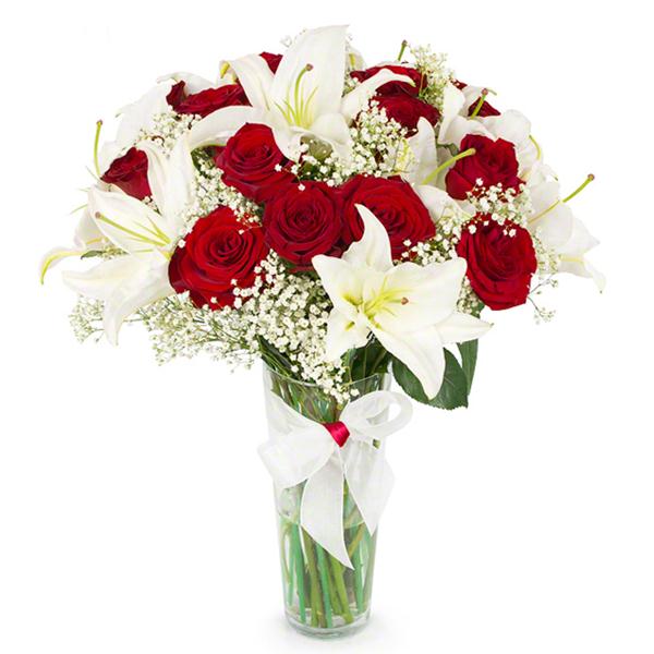 Cam Vazoda 15 Kırmızı Gül ve Lilyum