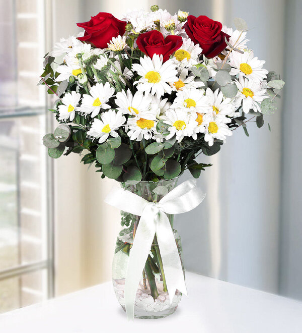 papatya ve gül ile cam vazoda hazırlanmış aranjman